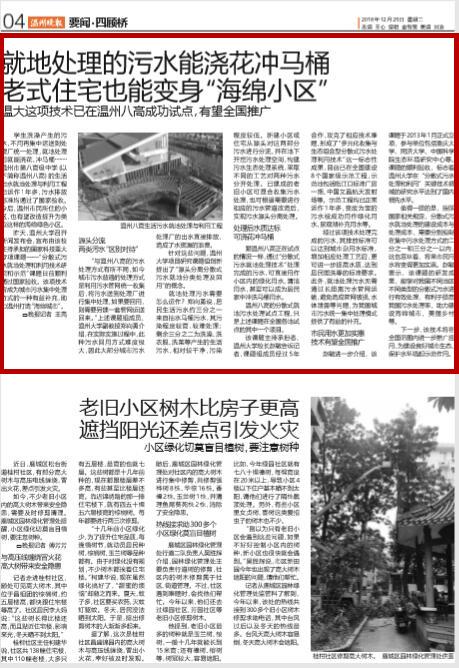 跟温州八高正在试点的情况一样,通过“分散式 污水就地处理技术”处理完成的污水,可直接用作小区内的绿化用水、清洁用水,甚至可以成为居民 家中冲洗马桶用水。