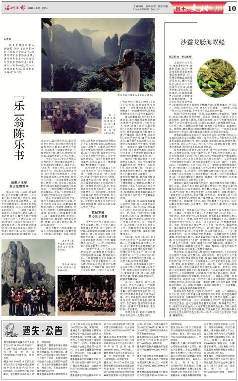 今年4月以来,我多次拜访陈乐书的夫人、原瓯海中学副校长、97岁高龄的陈璧老人,她回忆说:“陈乐书一生助人为乐,但自身的病也不少。1974年从温师院退休后,在好友周丕振的帮助下,开始断续隐居雁荡山疗养身体,前后长达22年……他还在雁荡山免费教小提琴、二胡,与当地人的关系极好,连白云庵的尼姑都成了他的学生……”我的同事叶文辉的老家就在雁荡山,他说:“小时候常去北斗洞附近听陈乐书先生拉琴。”