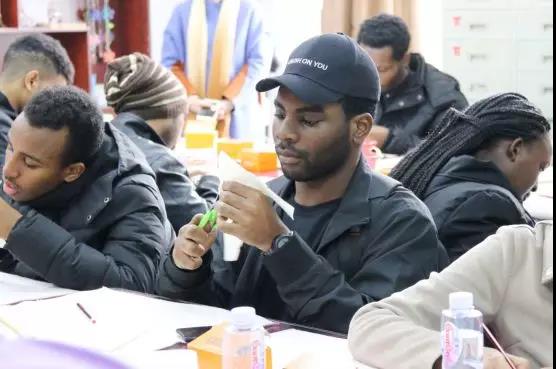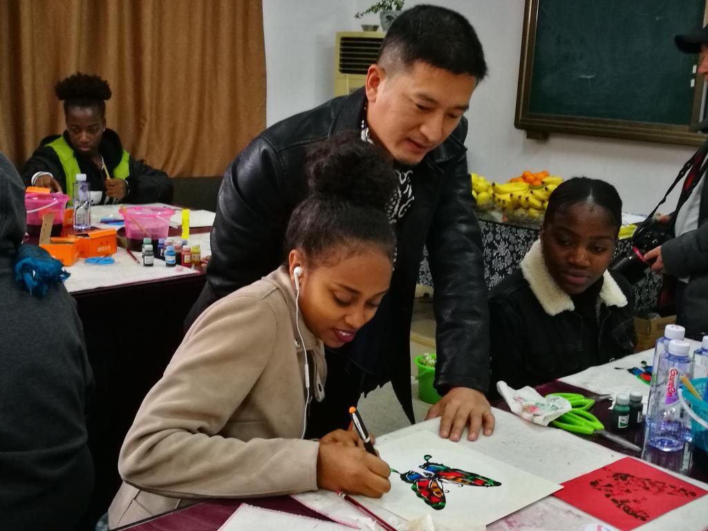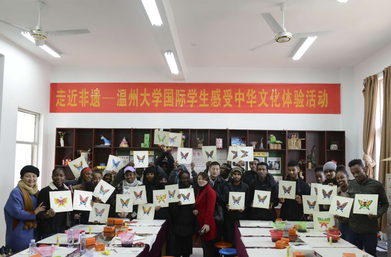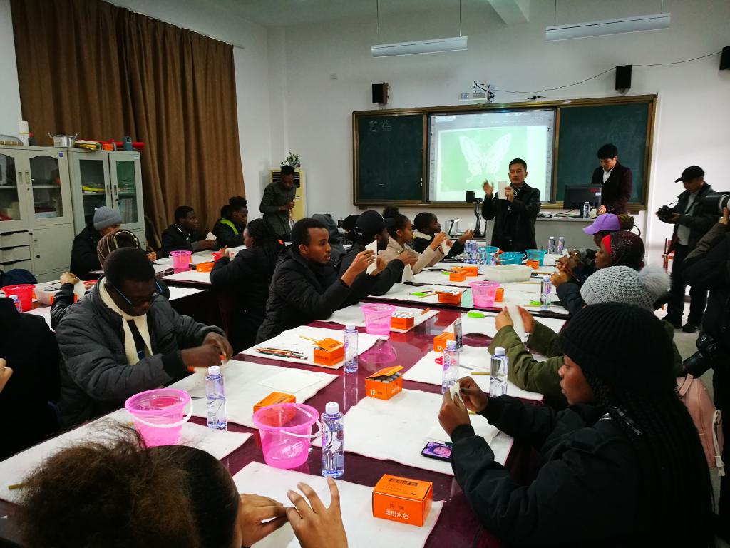 “要找出对称的地方,里面的花纹对折剪”“主要的技法是点染,基本不运笔”“桔黄色渗透能力强,要注意对水分的把控”……留学生们边听老师讲解边操作,饶有兴致地描绘蝴蝶轮廓、裁剪、点色和装饰。不一会儿,一只只五彩缤纷的“蝴蝶”便在纸上呈现。