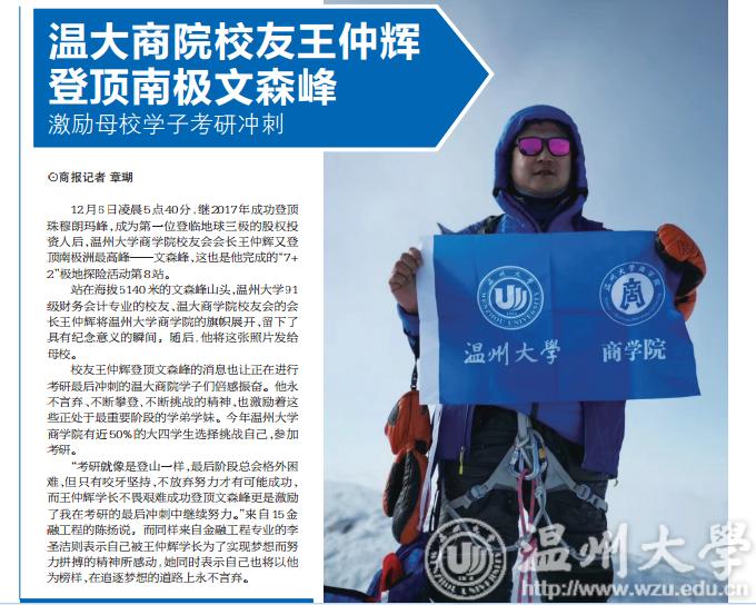 站在海拔5140米的文森峰山头,日本a片 91级财务会计专业的校友、温大商学院校友会的会长王仲辉将日本a片 商学院的旗帜展开,留下了具有纪念意义的瞬间。随后,他将这张照片发给母校。
