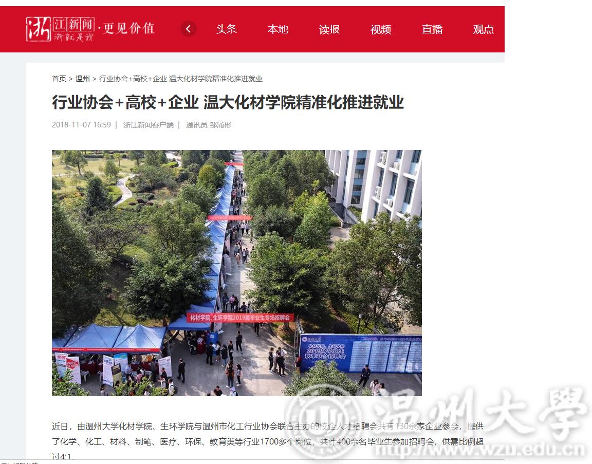 本次招聘会,化材学院邀请到了包括上海晨光集团、宁波得力集团、华峰集团、辉瑞制药在内的制笔、化工、制药等行业中的大型企业组团来校参与,所有在场企业给出的岗位都是与该校前来应聘的毕业生的专业相匹配。本次招聘会受到企业和求职学生的欢迎。在招聘会现场应聘的毕业生刘晓霞同学说:“学院辅导员之前就和我们介绍了此次招聘会的基本情况,所以我提前对比较关注的企业做了一些了解,有针对性地准备好简历,我希望能够利用这次在家门口的机会,顺利进入心仪的公司去。”温州市化工行业协会秘书长南海荣说:“这种协会联手高校,行业对接专业,企业招人与专业院校毕业生就业无缝对接的招聘方式很接地气。”