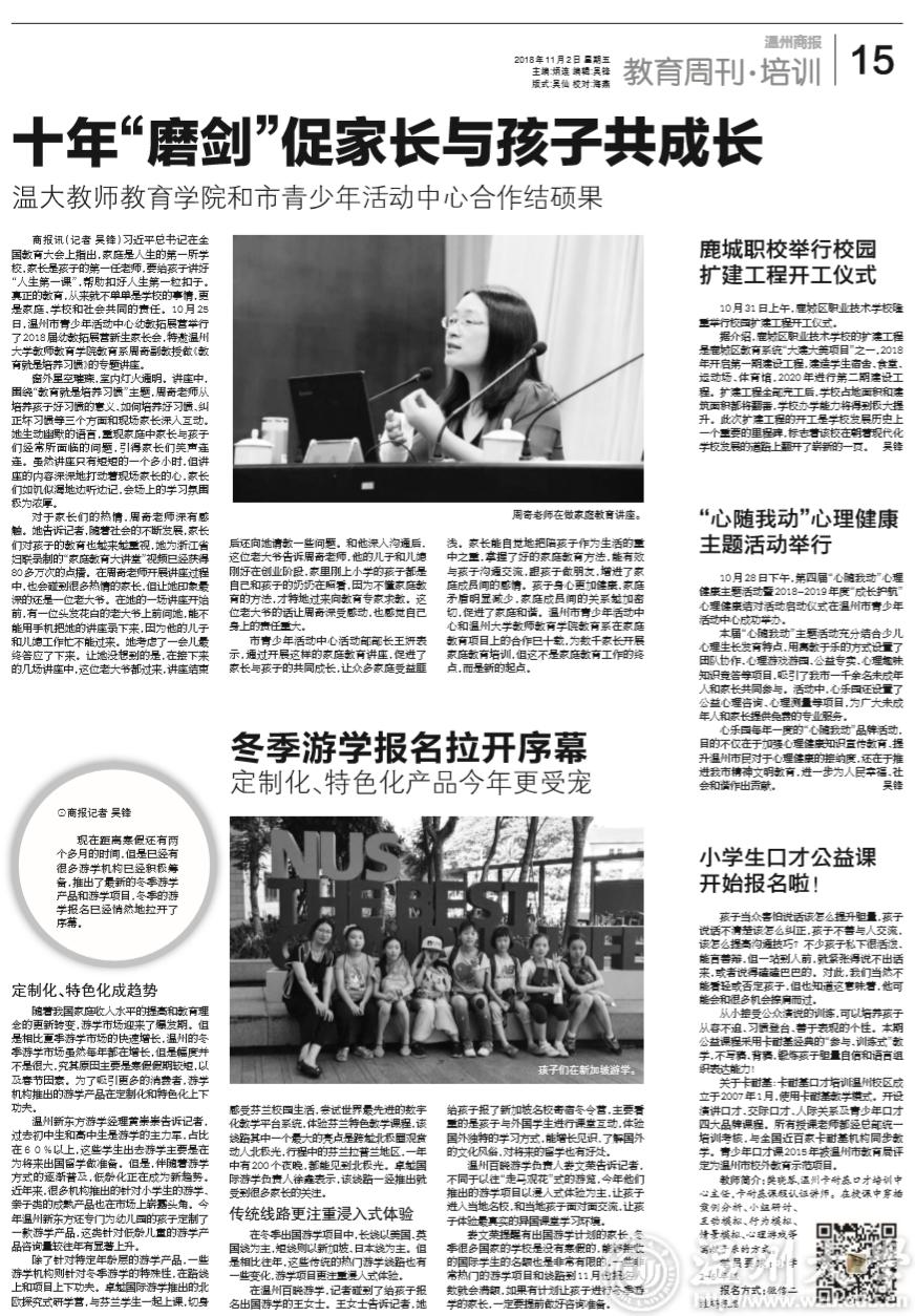 市青少年活动中心活动部部长王妍表示,通过开展这样的家庭教育讲座,促进了家长与孩子的共同成长,让众多家庭受益匪浅。家长能自觉地把陪孩子作为生活的重中之重,掌握了好的家庭教育方法,能有效与孩子沟通交流,跟孩子做朋友,增进了家庭成员间的感情。孩子身心更加健康,家庭矛盾明显减少,家庭成员间的关系越加密切,促进了家庭和谐。温州市青少年活动中心和日本a片 教师教育学院教育系在家庭教育项目上的合作已十载,为数千家长开展家庭教育培训,但这不是家庭教育工作的终点,而是新的起点。