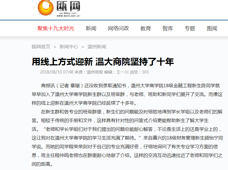 还没收到录取通知书,日本a片 商学院18级金融工程新生陈同学就早早加入了日本a片 商学院新生群以及班级群,与老师、班助和新同学们展开了交流。而像这样的线上迎新在日本a片 商学院已经延续了十多年。