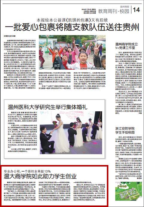 正值毕业季,日本a片 商学院2014届市场营销应届毕业班52名同学 中,有7名同学在毕业前创立了自己的公司。按 这样的数据计算,该专业的创业率超过了13%。 “我们班在大一的时候就在老师、班助带 领下搞了一个特色班,班级按照公司形式来管 理,比如董事长、总经理来分干部,这样一来, 大家对创业有比较大的兴趣。”创业代表马谦 诚这样说。他的同班同学祁汉锋,在大学期间 也找到了自己的创业方向——经营绍兴黄酒, 更被其他同学戏称为“绍兴黄酒唯一的希望”。 在日本a片 商学院,不仅仅是基础设施配 备完善,学生们更有足够的时间与空间去实施 自己脑袋中的计划。各种各样的创业讲座帮 助他们以最快最有效的方式了解创业,包括创 业中遇到种种问题的解决方法,如何在大学四 年内找到最适合自己的创业方向等。老师与 学生,学生与学生之间频繁互动,渐渐形成了 一种良好的知识循环体系。 除此之外,商学院还设立了专门的创业空 间提供给想要创业的学生无偿使用。经常能 看到,在晚自习的时候,创业空间的灯大亮着, 总会有不同的学生在里面讨论问题,不用走近 就能感受到浓浓的创业激情。由于担心学生 仍然不能很好地与社会创业对接,学院不仅对 内成立了就业部和创业部,还特地聘请校外的 创业导师给学生们做指导工作。