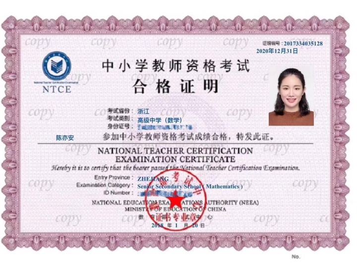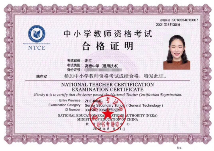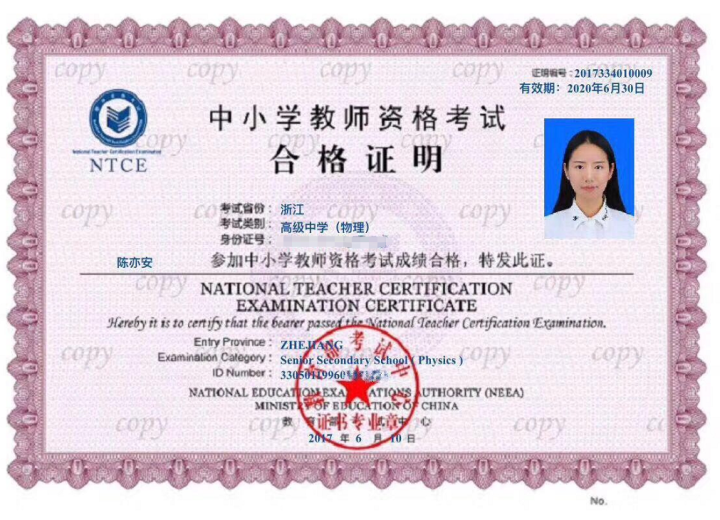 “根据规定,我们是大三下学期才开始考教师资格证的,因为我是物理专业,所以2017年上半年,我先考了物理教师资格证。”陈亦安说。2017年下半年,进入大四的陈亦安发现,湖州当地的学校对物理教师的需求量正在减少,担心找不到物理岗位工作的她,便利用空余时间又考取了一张数学教师资格证。“两证在手,更有安全感。”