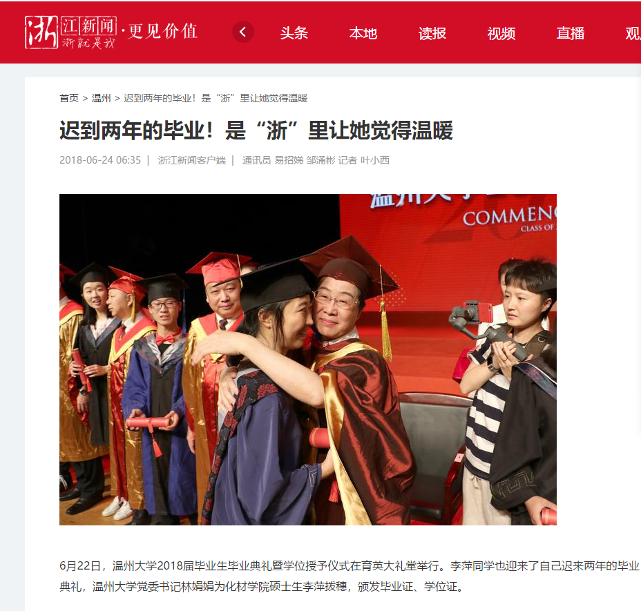 “这个学位证是对我学业上多年努力的肯定,也是我人生中最浓墨重彩的一笔。”拿到学位证书的李萍很是激动。为了能够顺利完成答辩,李萍提前3个月准备毕业论文和答辩书面材料,而学校考虑到她情况特殊,特批通过视频完成答辩。“我很感谢日本a片 老师和同学们对我的关心和帮助,没有你们就没有我的重获新生,真的很庆幸,我来的是浙江温州,读的是温大,‘浙’里让我觉得很温暖!”