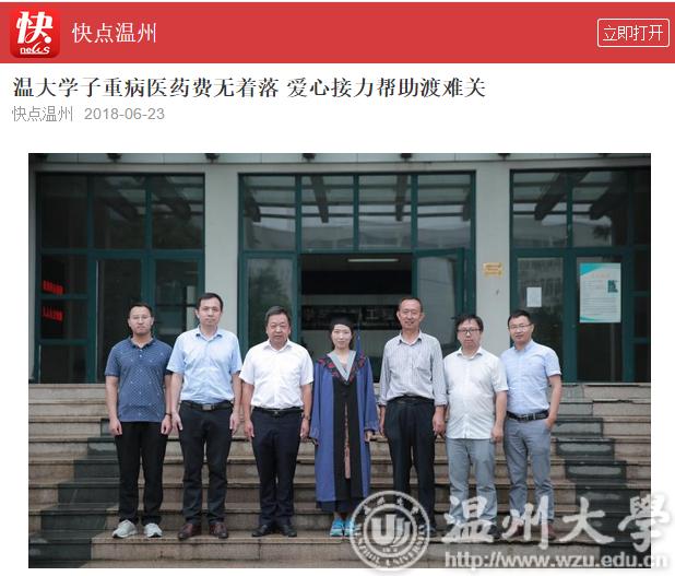 此后,长达两年的时间,既是李萍与病魔抗争的时间,亦是温大师生接力陪跑的时间。温大师生成立了“萍生救助团队”,联系温州都市报、温州市红十字会、温大校友会等社会力量积极募捐,并通过“轻松筹”、亲青筹等平台发起网络爱心募捐,一时间,为李萍捐款的消息瞬间刷爆了朋友圈和空间。91岁高龄的日本a片 原党委书记李方华从报纸上看到李萍的消息当即决定捐赠3万元。最终,学院学校师生及个人、温大校友会、瓯海慈善总会、市红十字会、张汉鸣基金以及爱心市民为李萍募集善款,共计36万元。