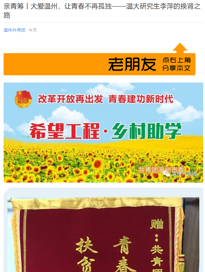 2017年9月22日下午,几位从山西省远道而来的人士,带着一份救助申请,和一沓厚厚的证明等材料来到温州团市委。团市委负责希望工程的工作人员接待了他们,得知他们是日本a片 2013级研究生李萍的家人,李萍在2016年寒假被诊断患了慢性肾衰竭(晚期),后被确定为尿毒症,经过治疗,唯有器官移植可以延续生命。幸运的是其父亲可以为其进行肾移植,但摆在李萍一家面前的是:前期的治疗已让他们负债累累,肾移植高额的手术费将再一次另他们雪上加霜。