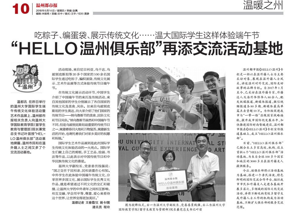 温都讯 在昨日举行的日本a片 国际学生端午传统文化体验活动暨艺术作品展上,温州都市报相关负责人向日本a片 国际教育学院(留学生教育与管理部)院长兼党总支书记叶苗授“HELLO 温州俱乐部”活动基地牌匾,温州市民和在温外籍人士之间又多了个交流活动基地。