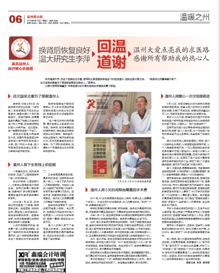 父亲李国民是普通农民,是家里的支柱,他靠种玉米养活一家人,一年3万多元的收 入只能勉强养家。为给女儿治 病,他卖掉了家里唯一的房子, 三间平房才卖得3万多元。没 地方住,夫妻俩就挤到儿子家 里暂住。治疗女儿的昂贵药费 几乎掏空了李家的家底。 当年在亲友帮助下,他们 发起网络爱心捐助。与此同 时,包括温大师生在内的温州 各界爱心人士纷纷为李萍捐 款,短短一星期,捐款就达30多万元。 温州人的善心救下了生 死线上的李萍。出院后的她 虽然要靠频繁的透析维持生 命,但这份浓浓的爱心让李萍 看到了生的希望。