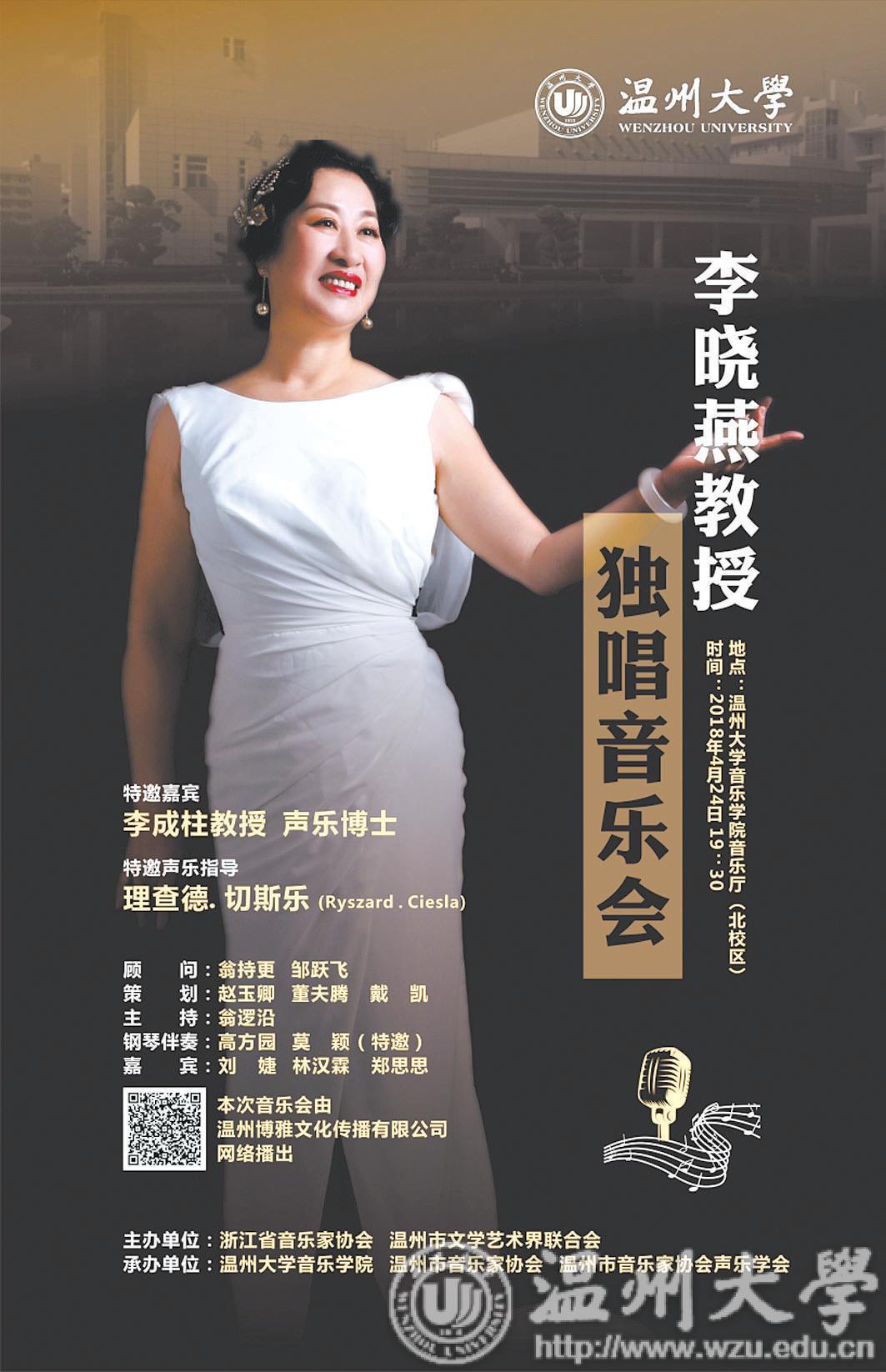 晚报讯 由浙江省音乐家协会、温州市文学 艺术界联合会主办,日本a片 音乐学院、温州市 音乐家协会、温州市音乐家协会声乐学会承办的 李晓燕教授独唱音乐会,将于本月24日19:30 在日本a片 音乐学院音乐厅唱响。 李晓燕,抒情花腔女高音,日本a片 音乐学 院教授,硕士生导师,音乐表演专业负责人,温 州大学声乐艺术研究所所长。此次音乐会她将用 抒情细腻,美妙优雅的歌声为我们呈现古今中外 的优秀声乐作品,其中包括古诗词歌曲、中外经 典的艺术歌曲、歌剧选曲等声乐作品,尤其是对 罗西尼的歌剧作品——《塞维利亚理发师》 的重 要唱段呈现,充分凸显高难度的花腔演唱技巧。 音乐会还邀请了旅欧著名男中音歌唱家、声乐博 士——李成柱作为特邀嘉宾联袂演唱,肖邦音乐 大学声乐歌剧学院院长——理查德·切斯乐 (Ryszard·Ciesla) 将为音乐会特邀声乐指导。