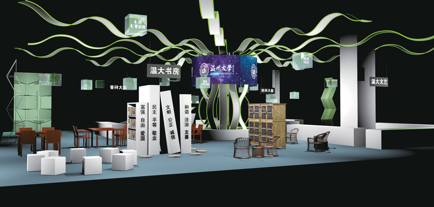 在温大展区,有一块区域叫“温大书房”,实际上是温州高校的一个共享区域,为文创青年和文创项目提供可以交流的场地。这也是院校展区首次出现这样开放、共享、交流的概念。你可以在“温大书房”品咖啡享书香,也可以在涂鸦墙上感受色彩世界。但更重要的是,有想法的朋友们可以聚在这里,一起进行头脑风暴。