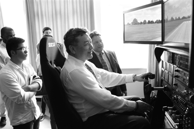 美国桥水州立大学亚洲研究部主管dr.chien wen yu体验六自由度全动式模拟飞行器。
