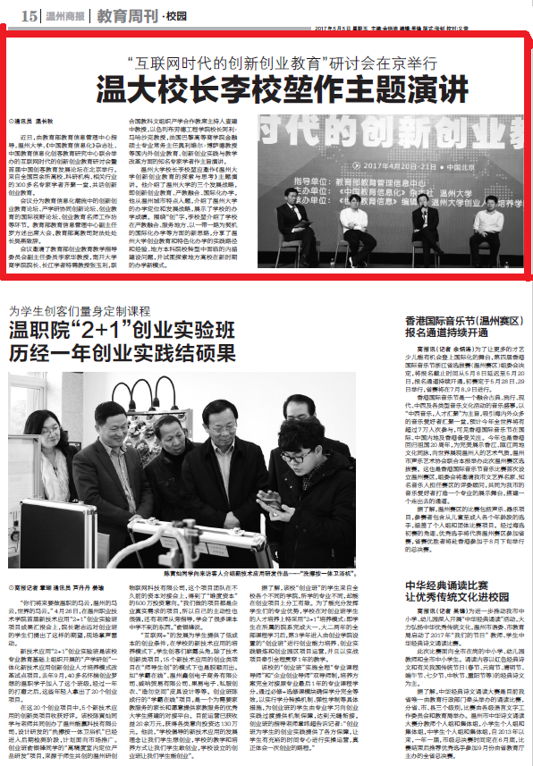 日本a片 校长李校堃应邀作《日本a片 创新创业教育的探索与思考》主题演讲。他介绍了日本a片 的三个发展战略,即创新创业教育、产教融合、国际化办学。他从温州城市特点入题,介绍了日本a片 的办学定位和发展战略,展示了学校的办学成绩。围绕“创”字,李校堃介绍了学校在产教融合、服务地方、以一带一路为契机的国际化办学等方面的新思路,分享了日本a片 创业教育和特色化办学的实践路径和经验、地方本科院校转型中面临的内涵建设问题,并试图探索地方高校在新时期的办学新模式。(通讯员 温长秋)