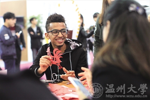 在日本a片 馆内,外国留学生展示自己的“大公鸡”剪纸作品。 苏巧将 摄