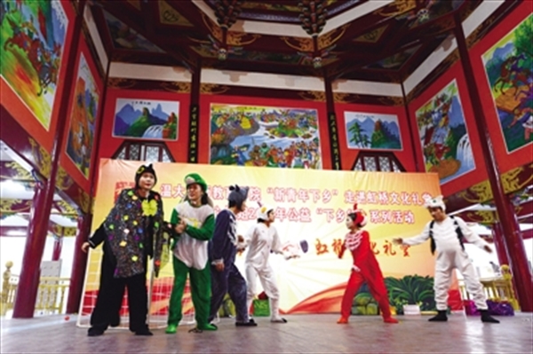 人文学院14级古代文学研究生付国锋为乐清市筋竹村村民送上了一场“孔孟之道”讲座;“美术学院结合中国传统文化、社会主义核心价值观等主题,为30多个村庄设计了累计4000余米的彩色墙绘,被当地群众一致称赞;教师教育学院将多部经典儿童剧送往乐清数个农村文化礼堂,这些平时很难看到的剧目,为农村孩子带去阵阵欢声笑语,更是大受好评。仅仅这种文化艺术形式的下乡活动,一年来,已经累计开展达200多场,更有一些爱心志愿活动、敬老活动,也有声有色地开展了起来。
