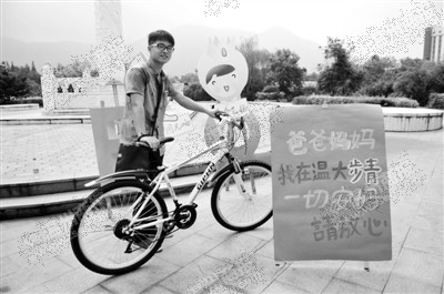 “爸爸妈妈,我在温大步青,一切安好,请放心。”新生钟鸿博带着自己的自行车与海报合影,然后通过微信将合影照片发回给在老家的母亲。