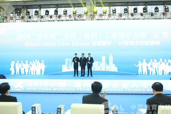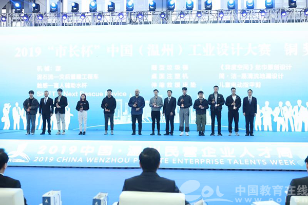 中国教育在线浙江站讯(记者 郭端宇 通讯员 杨丽君 侯旭丹)11月26日,2019“市长杯”中国(温州)工业设计大赛的颁奖典礼举行。25日作品路演结束后,经过专家评委的讨论分析,最终在本次大赛16强的作品中诞生了铜奖10名,银奖4名,金奖2名。温州市委市政府领导为选手颁奖并合影留念。