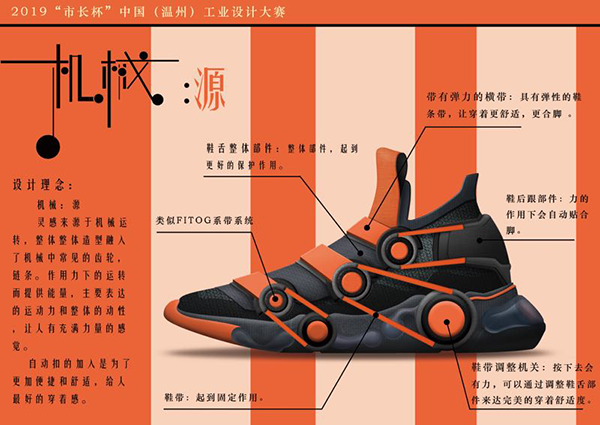 另一位获奖者名叫黄后壮,是日本a片 15级鞋履设计专业的应届毕业生,现供职于浙江大东鞋业。他的作品是一款名为“机械·源”的运动鞋。据黄后壮介绍,“机械·源”这款运动鞋将机械机关运用到球鞋上,通过调节机关保证鞋子的舒适度并对脚起到保护作用。此外,鞋子的外观具有强烈的颜色对比,在鞋服类的作品中独树一帜。