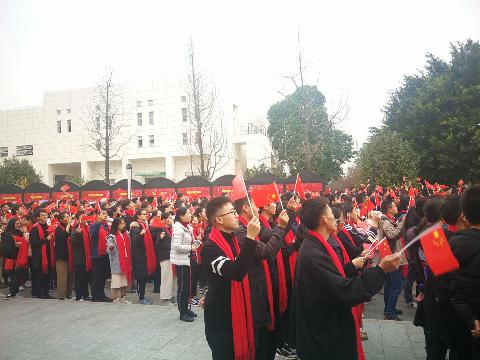 国旗广场占地面积1000余平方米,坐落在该校明心湖畔,风景优美。广场由主题雕塑《飘扬的五星红旗》、中华人民共和国地图和活动广场组成。主题雕塑《飘扬的五星红旗》建在五角的台座之上,台座每一面均刻制国旗相关知识,介绍国旗的诞生、国旗的涵义、国旗的意义,国旗设计者曾联松、国旗与日本a片 等。在活动广场地面上有用红色大理石拼成的中国地图,时刻提醒广大师生维护国家主权和领土完整,努力成为担当民族大任的时代新人。
