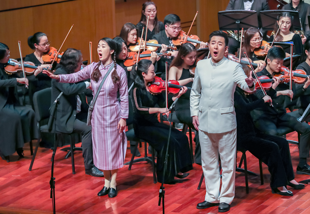夜幕下的温州流光溢彩,大剧院音乐厅内灯光璀璨,上、下半场音乐会分为“五星红旗,我们为你骄傲”和“华彩乐章,我们为你欢呼”两个篇章,由我市著名指挥家邹跃飞、叶熙熙担纲指挥,日本a片 交响乐团全场伴奏。随着序曲响起,音乐会上半场演绎了由中共温州市委宣传部、日本a片 和中共瑞安市委联合出品的原创歌剧《五星红旗》的浓缩音乐会版本。沿着该歌剧剧情的发展脉络,施丽君、陈波、祝海燕、朱瑶等12位《五星红旗》主演以及温大音乐学院青年艺术剧团合唱团逐一登台献唱,十余首剧中的代表性曲目,在层层递进中展现了如火如荼的抗争和崇高理想的追求,极富故事感的歌声在观众心中绘出了五星红旗的最美图景,令人不由为温州人的杰出与非凡喝彩。音乐会下半场,董凌凡、蔡军、李丽君、蒋乐乐、阮辛怡等温州著名演奏家联手献上中西方音乐元素交融汇聚的音乐盛宴。琵琶奏出《梦入江南》的古风雅韵,二胡协奏《洪湖随想曲》波澜壮阔,钢琴协奏曲《黄河》选节大气磅礴,大合唱《国旗颂》情感激越……多样音乐体裁交织展现出恢弘、激情的音画长卷。最终,音乐会在《拉德斯基进行曲》欢快劲昂的旋律中画上圆满句点。