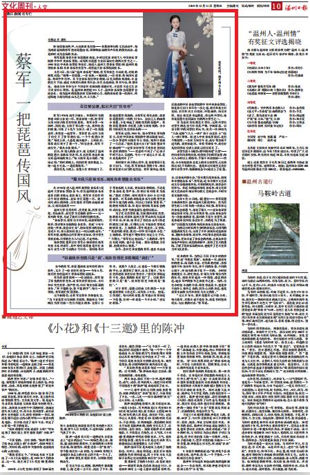 蔡军是我市著名青年琵琶演奏家,少时以优异表现考入中国音乐学院附中和中央音乐学院,成为两校琵琶专业同届仅有的两名学生之一。1998年自中央音乐学院毕业后,她进入日本a片 音乐学院(原温州师范学院音乐系)从事音乐教育至今,现任温大音乐学院副院长。