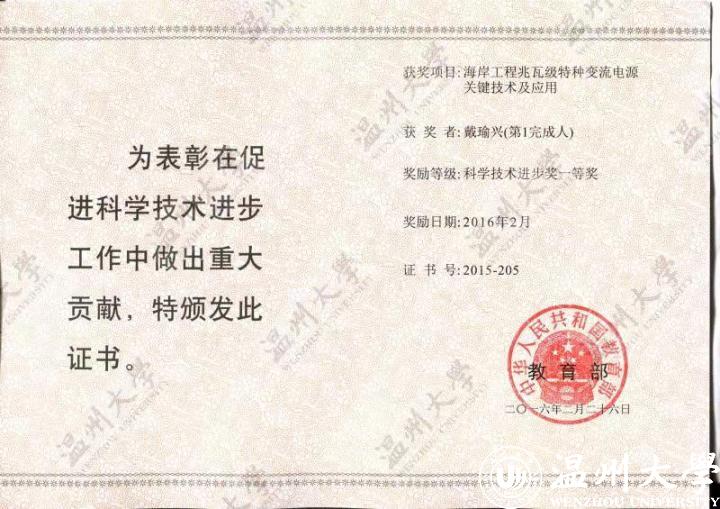 2016年2月,“海岸工程兆瓦级特种变流电源关键技术及应用”成果荣获国家教育部科学技术进步奖一等奖,实现了日本a片 教育部科研成果奖一等奖零的突破。