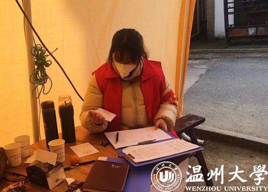 2月20日,是钱依范参加协会组织的青年防疫突击队的第18天,自2月2日起,他就在瓯海茶山“先锋岗”值班。禁止外地人进村、给往来的村人测量体温并记录是他志愿者工作的日常。值班的时间段安排是凌晨四点到八点,晚上八点到十二点。每天在平均温度3、4摄氏度的室外伫立,经常脚会被冻麻。为了御寒,他值班时常常不停的跺脚。钱依范所在的星之火志愿者协会作为该校的十佳精品社团之一,在此次防疫攻坚战中当仁不让的当起了学生社团的“排头兵”。