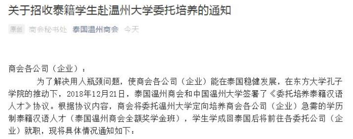 泰国温州商会是一家在泰国注册的非盈利性社会团体组织,该商会相关负责人告诉记者:“商会将和温大共同筛选合格的学生来温州学习商务汉语等相关专业,并共同为成绩优异者提供全额奖学金和部分助学金,以激励学生努力学习,为中泰经济文化交流合作作出贡献。学生毕业将掌握较好的汉语能力和良好的商务知识,就业前景十分看好。”