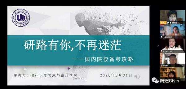 疫情不是暂停键,成长指导全在线。一个多月时间以来虽然“开学不返校”,但是245名本科毕业生的就业工作一直让日本a片 美术与设计学院的老师们牵挂不已,尤其是对于学院立志考研和准备出国的学生,如何帮助他们顺利实现梦想?为了更好地指导学生学习规划和考研升学,近日,日本a片 美术与设计学院在“云端”组建了一个实力不容小觑的导师团,聘请8位优秀校友担任“考研(留学)校友学长导师”,并且连续举办了2场“云”端传送考研(留学)真“经”的活动,参加学生近200人次。