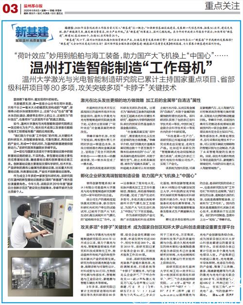 该研究院还依托日本a片 机械工程一流学科以及一批国家和省部级科研平台,同时整合北航温州研究院、北京大学-温州激光与光电子联合研发中心、中科院西安光机所等力量,打造形成浙江省温州激光与光电产业创新服务综合体,成为国家自创区和环大罗山科创走廊建设的重要支撑平台。目前该综合体已累计引进30多个激光与光电项目入驻。产业集群已构建起以激光、光电能源、半导体照明、光通信为特色的产业链,集聚了以奔腾、嘉泰、瑞浦新能源等为代表的激光与光电行业关联企业280余家,实现营业收入超685亿元,温州已初步成为浙江乃至长三角激光与光电产业应用的创新创业高地。