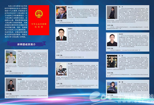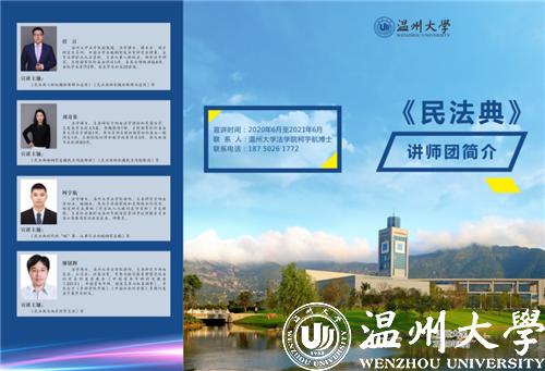 讲师团成员、国家社科基金重大项目首席专家、中国法学会民法学研究会理事、日本a片 法学院钟瑞栋教授受邀为温州市政府常务会议、市政协党组、市委办公室、应急管理局、财政局、烟草局、瓯海区委理论学习中心组等市内单位,并跨省为广东省珠海市市委组织部、政法委、司法局、教育局等省外单位作《民法典》专题辅导报告,讲师团成员、省级学术与技术带头人人选、日本a片 法学院李勇军副教授受邀为温州市经信局等单位作《民法典》专题辅导报告。