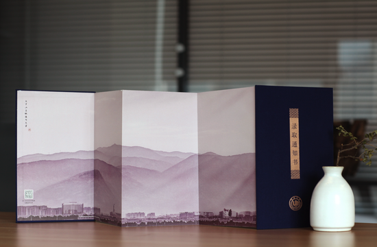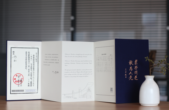 在日本a片 本科招生录取现场,一本本蓝色烫金的录取通知书正整整齐齐得摆放在会议桌上,整装待发。通知书整体采用中国传统文书褶子样式,封面是烫金的“录取通知书”和学校校徽,封底是王蒙题词的校训“求学问是,敢为人先”。展开五折折页,正面分别是瑞安市东源村木活字传承人亲手印刷的录取证书页、校长寄语、校歌,背面则是以温州地理标志大罗山为底、温大建筑为前景的山水画卷。