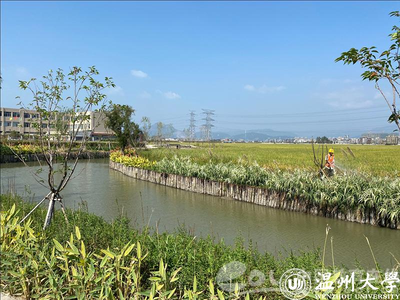 埭下河是另一条已经显现治理成效的河道,温大技术人员在河流两头设置了拦截坝,河面波光粼粼,岸边设有一整排的松木桩,边坡上种满了美人蕉等花卉植物。有工作人员正在对边坡植被进行养护。“半年前,这里可不是这番景象。河边就是大片农田,初期雨水、农药化肥、生活污水以前都直通入河,造成水中的氨、氮、磷等指标严重超标。”郑向勇介绍,今年4月,温大技术团队开始介入治理。拦截坝让原河道形成前置库生态塘,能够对面源径流及日常农田排水进行拦截,生态塘系统的自净功能则可以实现对氮磷的吸收净化;河岸边设置松木桩、种植湿生植物、挺水植物,是为了形成生态堤岸,实现对入河污染源中的颗粒物和氮磷等进行拦截和净化。