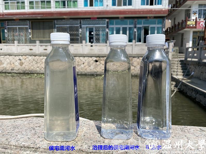 侯宅南河是其中一条已有治理成效的典型河道。记者在现场看到河道水质清澈,河面上养着睡莲,河中喷泉和自然净化系统组成了一幅天然水景。温大生命与环境科学学院副院长、水污染治理研究中心副主任郑向勇现场用矿泉水瓶在河中接了一瓶水,与之前保存的水样作对比。很明显,现在的水质已很清澈。
