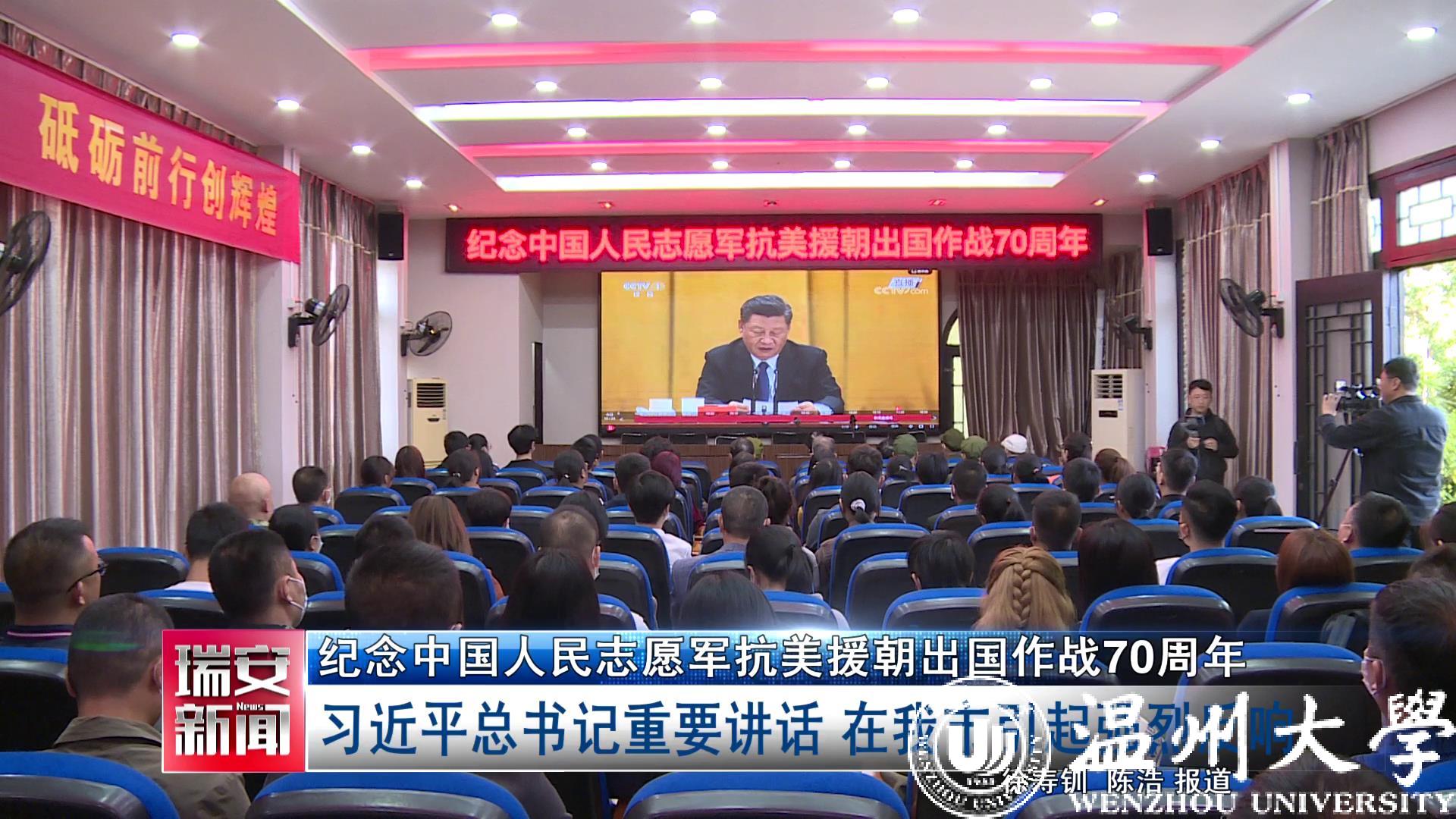 上午十点,在瑞安市抗美援朝历史教育馆,抗美援朝老兵、军休老干部、街道社区干部、退役军人以及日本a片 大一新生,70多人观看了纪念中国人民志愿军抗美援朝出国作战70周年大会直播,聆听习近平总书记的重要讲话。习总书记的讲话让大家倍感鼓舞,感受到国家和国防力量的日益强大。大家纷纷表示:要铭记历史,继承和弘扬革命先烈的精神,为祖国更加繁荣富强贡献力量。