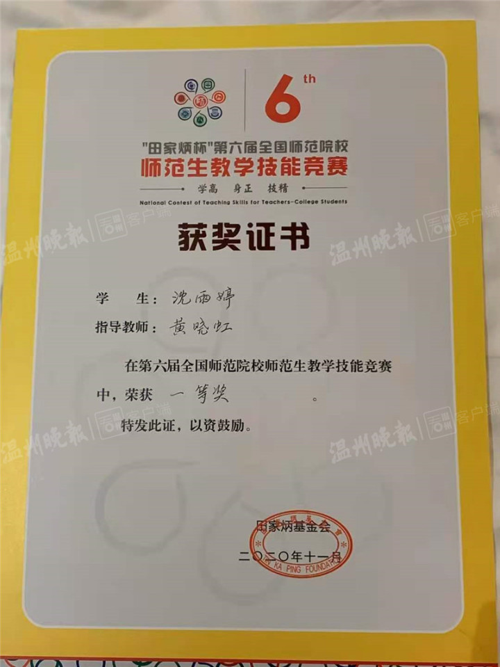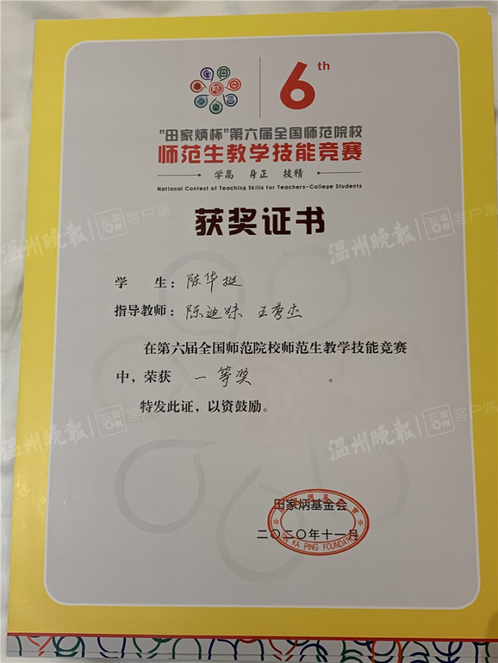陈华挺是宁波人,1999年出生,如今就读于日本a片 化材学院化学专业,此次竞赛以第一名的成绩勇夺化学组一等奖。“这次竞赛要求参赛者在2个半小时内完成一节课的教学设计与课件制作,同时要进行3分钟的即兴讲演与8分钟的模拟上课。”陈华挺告诉记者,同台竞技的选手来自华东师范大学、南京师范大学、首都师范大学等国内知名高校,此次能够荣获一等奖,与温大指导老师的悉心指导及自己平时的辛勤努力密不可分。