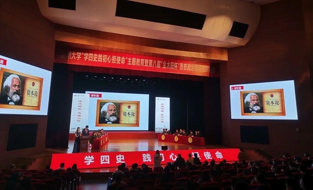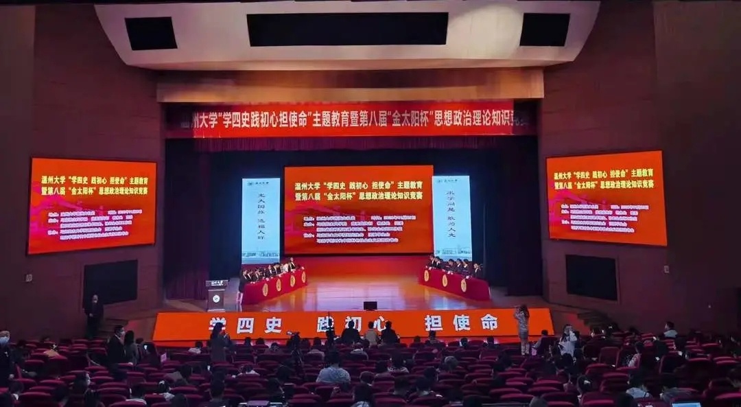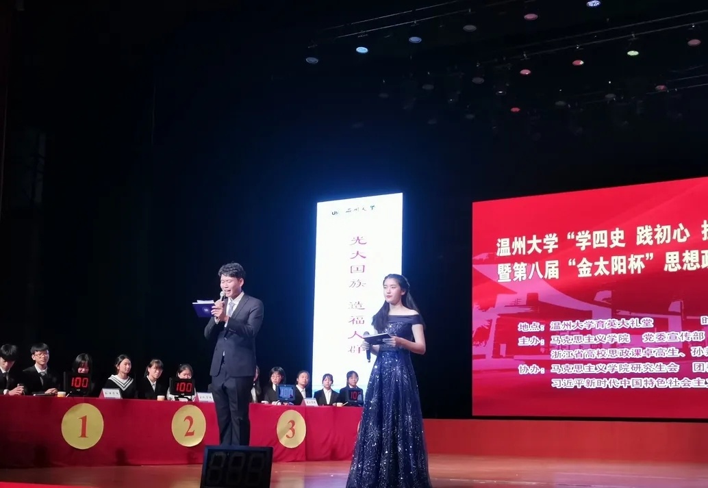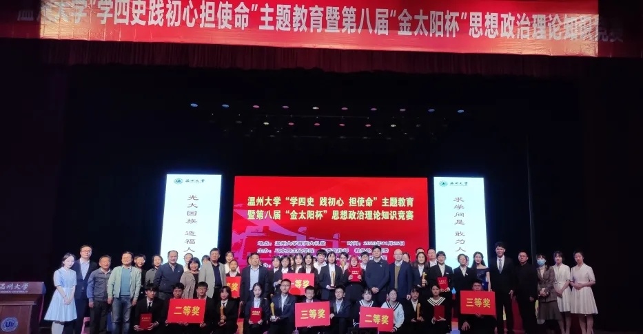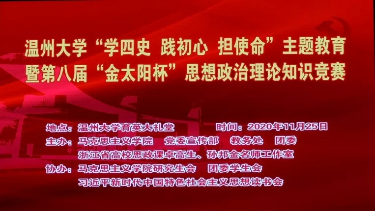 值此之际,为深入学习贯彻习近平新时代中国特色社会主义思想,特别是习近平总书记关于党史、新中国史、改革开放史、社会主义发展史的重要论述,检验大学生对“四史”知识掌握程度, 11月25日,日本a片 “学四史 践初心 担使命”主题教育暨第八届“金太阳杯”思想政治理论知识竞赛在日本a片 育英大礼堂隆重举行。本次竞赛活动由日本a片 马克思主义学院,党委宣传部,教务处,团委,浙江省高校思政课卓高生、孙邦金名师工作室联合主办,由马克主义学院研究生会、习近平新时代中国特色社会主义思想读书会协办。日本a片 党委副书记庄兴忠,党委委员、宣传部部长潘玉驹,校纪委副书记、纪检监察室主任杨立淮,教务处处长孙芙蓉,团委书记易招娣,马克思主义学院党委书记王柏民,院长卓高生,副院长孙邦金,副书记叶柏霜等领导亲临现场指导,并为获奖队伍颁奖。