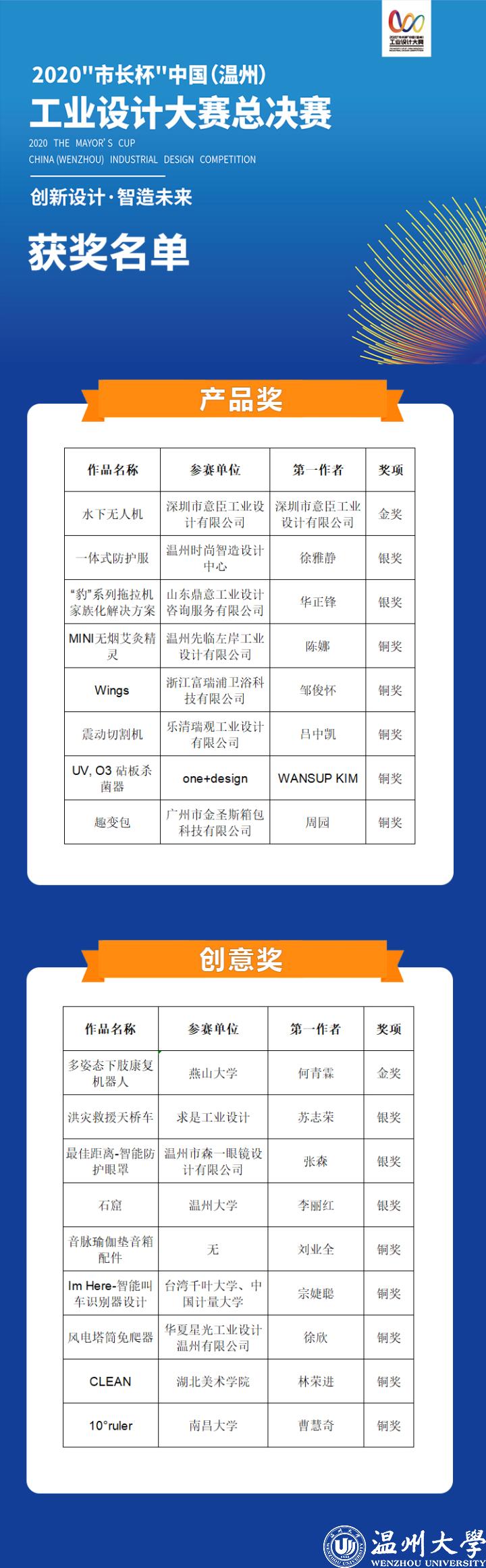来自深圳市意臣工业设计有限公司的设计作品“水下无人机”和燕山大学的设计作品“多姿态下肢康复机器人”,分获2020“市长杯”中国(温州)工业设计大赛产品奖和创意奖金奖。现场还颁发了产品奖银奖2名、铜奖5名,创意奖银奖3名、铜奖5名。