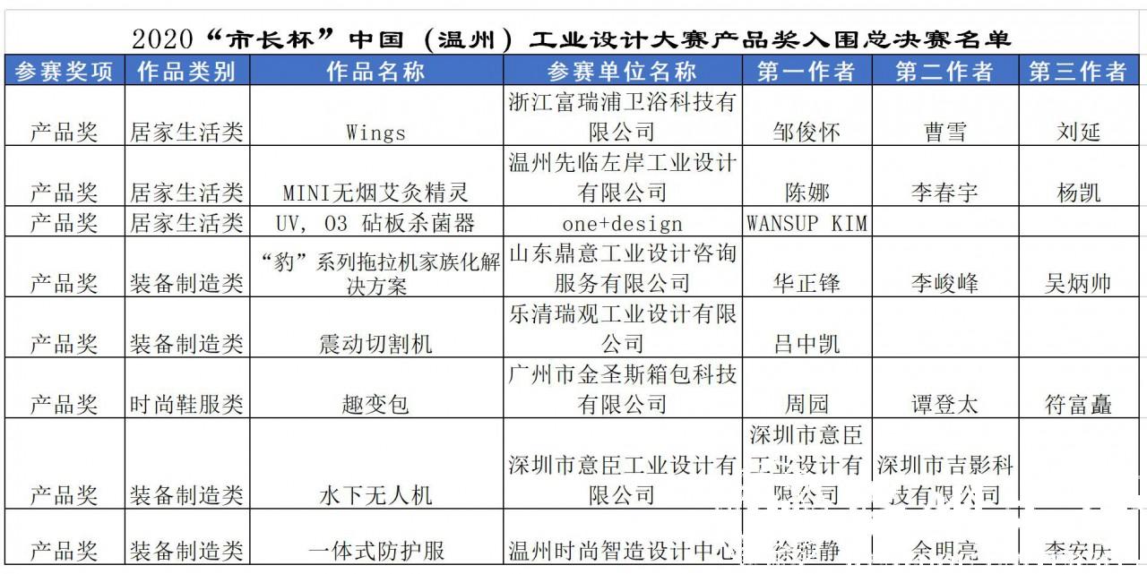 据悉,此次入围决赛的18件作品,将在2020年“市长杯”中国(温州)工业设计大赛的官网进行公示(//wzszb.66wz.com/),并于11月份下旬举办总决赛路演及颁奖典礼。