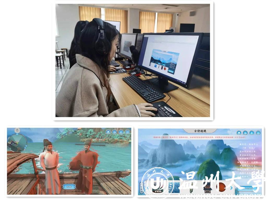 “这一教学项目打破了传统课堂输入式的教学模式,而是以闯关游戏、角色扮演等方式,启发学生学习兴趣,在游戏体验的过程中实现自主性学习、研究性学习。”项目负责人洪之渊老师介绍说,在这种虚拟仿真实验教学中,学生正幻化为谢灵运,在江心屿偶遇孟浩然、文天祥,还可以一起探讨诗歌。