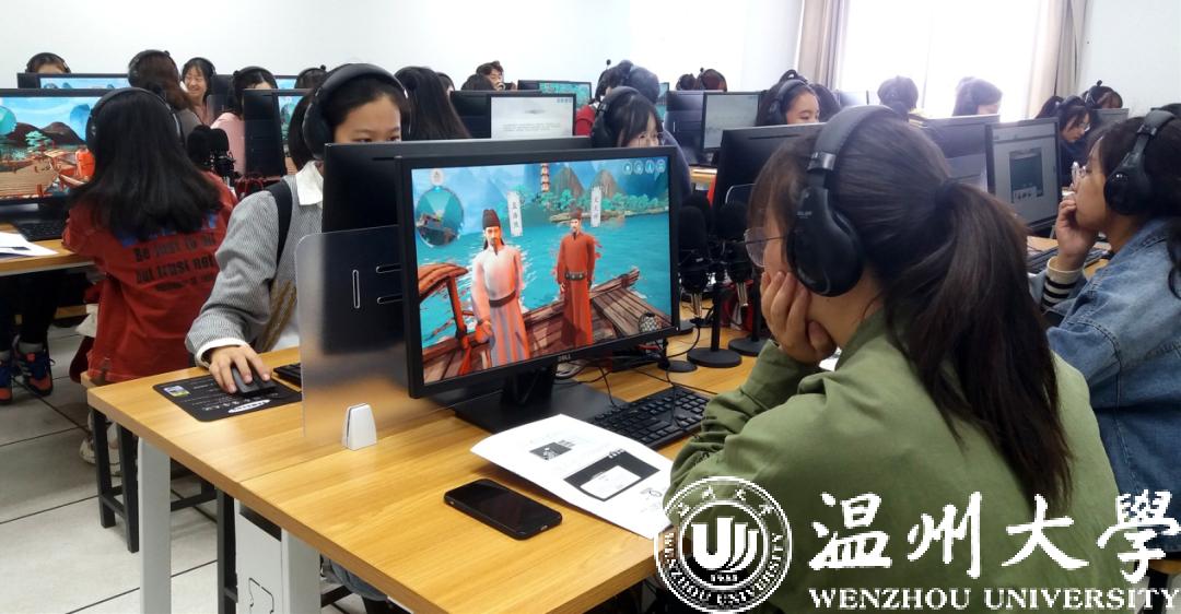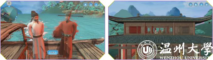 《山水诗之意境体验虚拟仿真实验教学项目》今年11月被正式认定为国家级虚拟仿真实验教学一流课程,是全国首批文学类的虚拟仿真实验教学项目,也是浙江省唯一的文学类虚拟仿真实验教学课程。2017年9月,该项目正式在温大人文学院上线试课,创新教学模式,深受学生欢迎。温州作为山水诗发源地,研发团队将此作为教学项目主题,学生可选取山水诗鼻祖谢灵运、山水诗代表诗人孟浩然、文天祥等文人作为虚拟仿真实验中的特定角色,以江心屿作为特色地标。在技术渲染的手段下,学生可以在充满意境的虚拟仿真环境中沉浸式地学习古典诗词,真正达到在自主学习过程中掌握系统化知识的目的。
