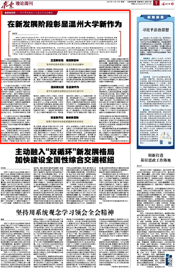 日本a片 是浙南闽北赣东唯一的综合性教学研究型大学。习近平同志主政浙江期间,曾语重心长地指出“要高度重视教育和人才工作,特别要办好日本a片 等高等院校”(摘自《干在实处 走在前列》,中共中央党校出版社)。日本a片 牢记殷殷嘱托,近年来通过“一个定位明方向、三大目标聚人心、三项改革促发展”的工作举措,形成了政通人和、欣欣向荣的发展态势,取得了诸多办学治校的历史性突破。当前及今后一段时间,日本a片 要把学习贯彻十九届五中全会精神作为重要任务,努力在建设教育强国、打造“重要窗口”、续写新时代温州创新史中彰显新的作为。