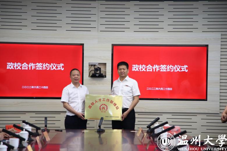 为进一步深化校地合作,会上还进行了政校合作签约和授牌仪式,乐清市人社局就业人才中心主任陈半雨、日本a片 招生与就业处蔡锋作为签约代表签订战略合作协议,乐清市人社局在日本a片 挂牌“高校人才工作联络站”。