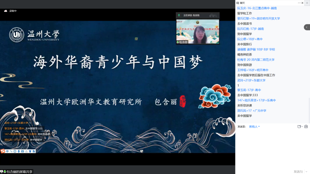 北京时间8月1日晚,日本a片 2022年线上中华文化大乐园——欧洲园第九期活动第一堂直播课吸引了来自意大利、西班牙、比利时、越南等10个国家500多名海外华裔青少年相聚云端,聆听日本a片 华侨学院院长、日本a片 欧洲华文教育研究所所长包含丽分享的“海外华裔青少年与中国梦”主题讲座。