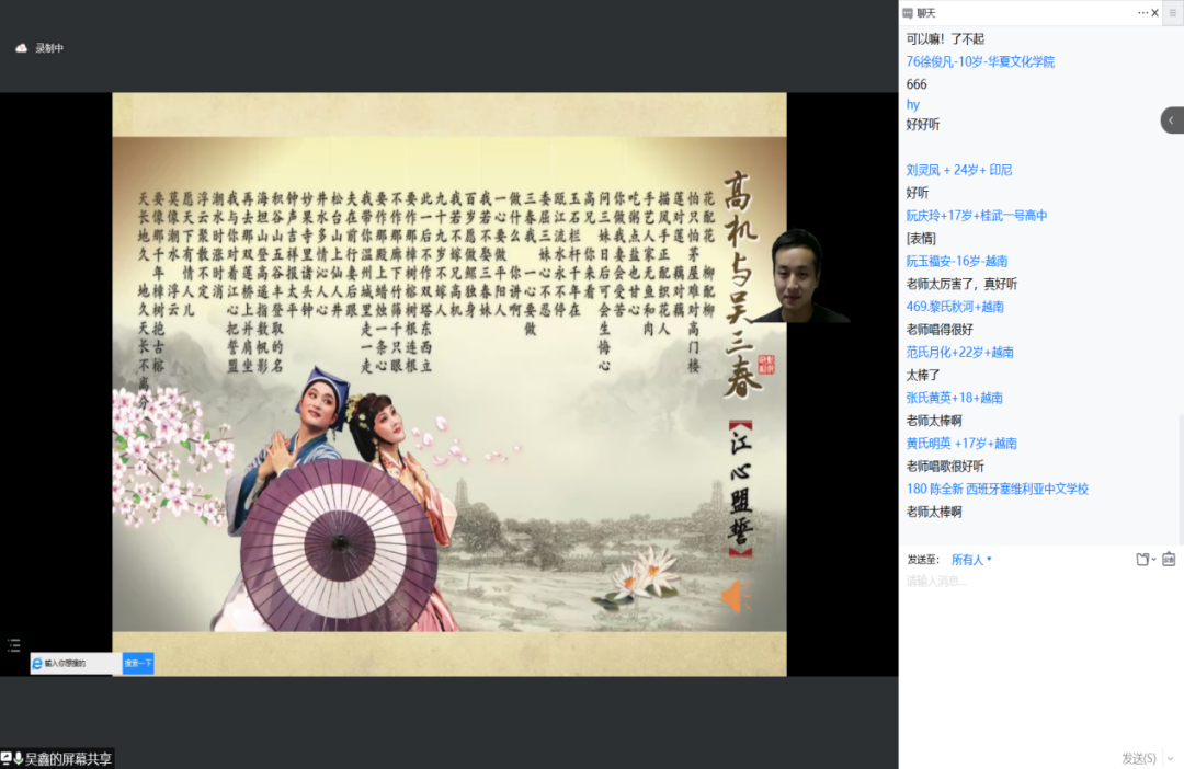 吴鑫老师为大家介绍了被后人称为四大南戏的著名作品《荆钗记》、《白兔记》、《拜月亭记》、《杀狗记》,将戏曲表演中的“四大”行当生、旦、净、丑,戏曲表演的“四功”唱、念、做、打等艺术手段做了详细讲解,还邀请学员进行线上跟唱,同学们参与热情高涨,零距离感受瓯剧的无穷魅力。