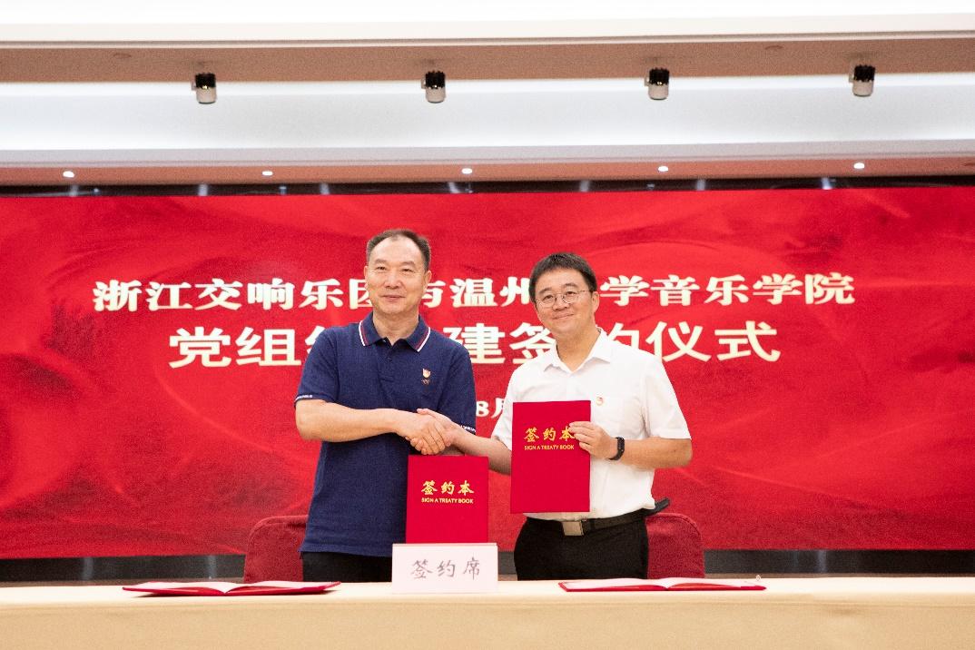 浙江交响乐团党总支书记、团长郭义江与温大音乐学院党委书记朱启鑫签约党组织共建合同书;