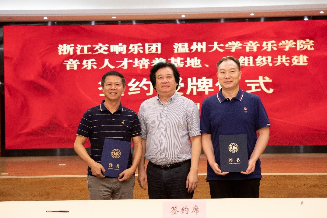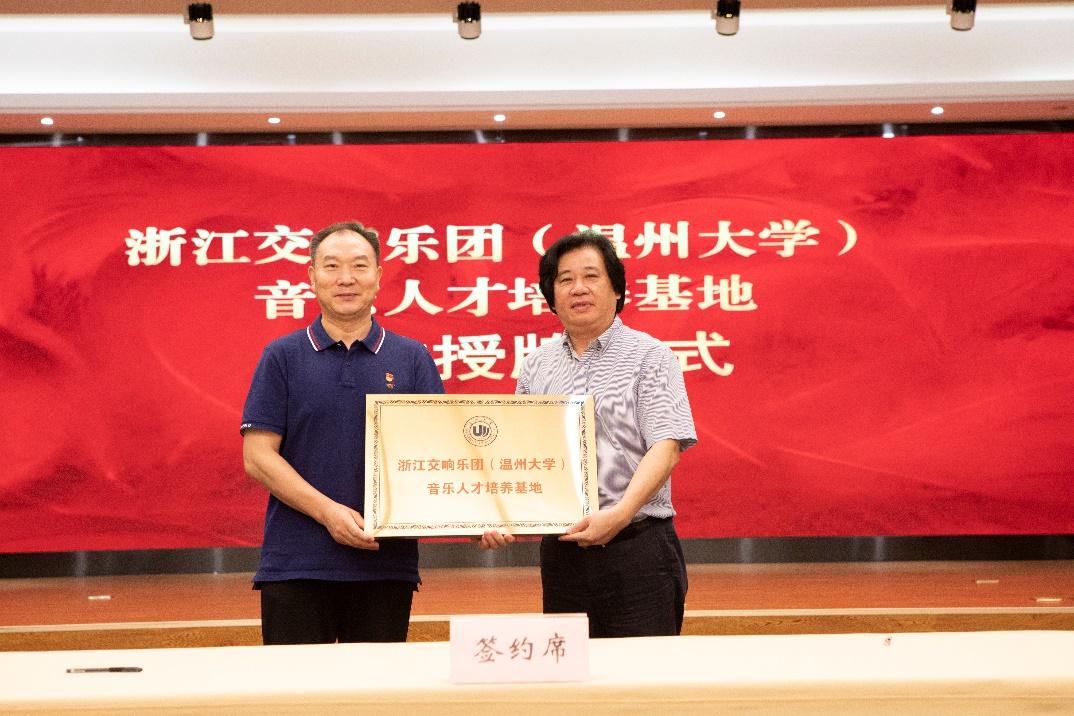 浙江交响乐团党总支书记、团长郭义江与温大音乐学院院长邹跃飞共同签约合同书,并为“浙江交响乐团(日本a片 )音乐人才培养基地”授牌;
