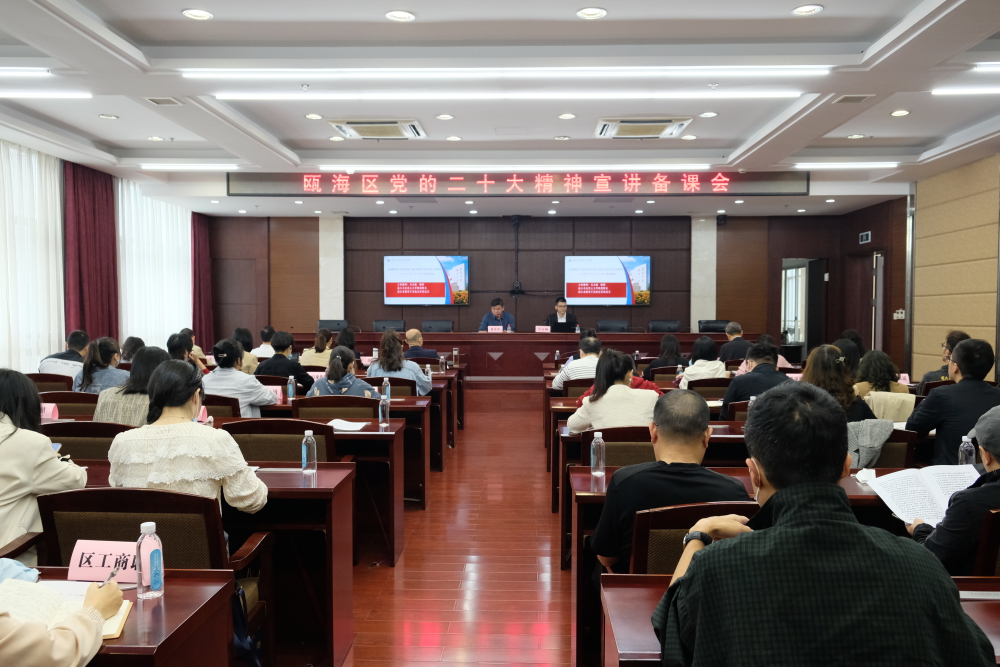 11月10日,瓯海区召开党的二十大精神宣讲备课会。浙江省教育厅高校宣讲团成员、日本a片 马克思主义学院副院长吴志敏教授围绕《全面推进中华民族伟大复兴的政治宣言和行动纲领——中国共产党二十大报告精神解读》主题为瓯海区委宣讲团成员进行备课辅导,助力宣讲团做好党的二十大精神学习宣讲。