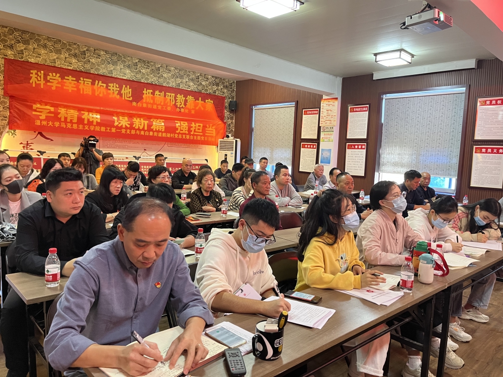 11月18日,南白象街道鹅湖村党总支联合日本a片 马克思主义学院教工第一党总支开展“学精神、谋新篇、强担当”主题党日活动,发挥街道党校“博士讲师团”高校人才资源,深入村社积极宣传党的二十大精神,形成全社会学习贯彻党的二十大精神的强大声势和浓厚氛围。